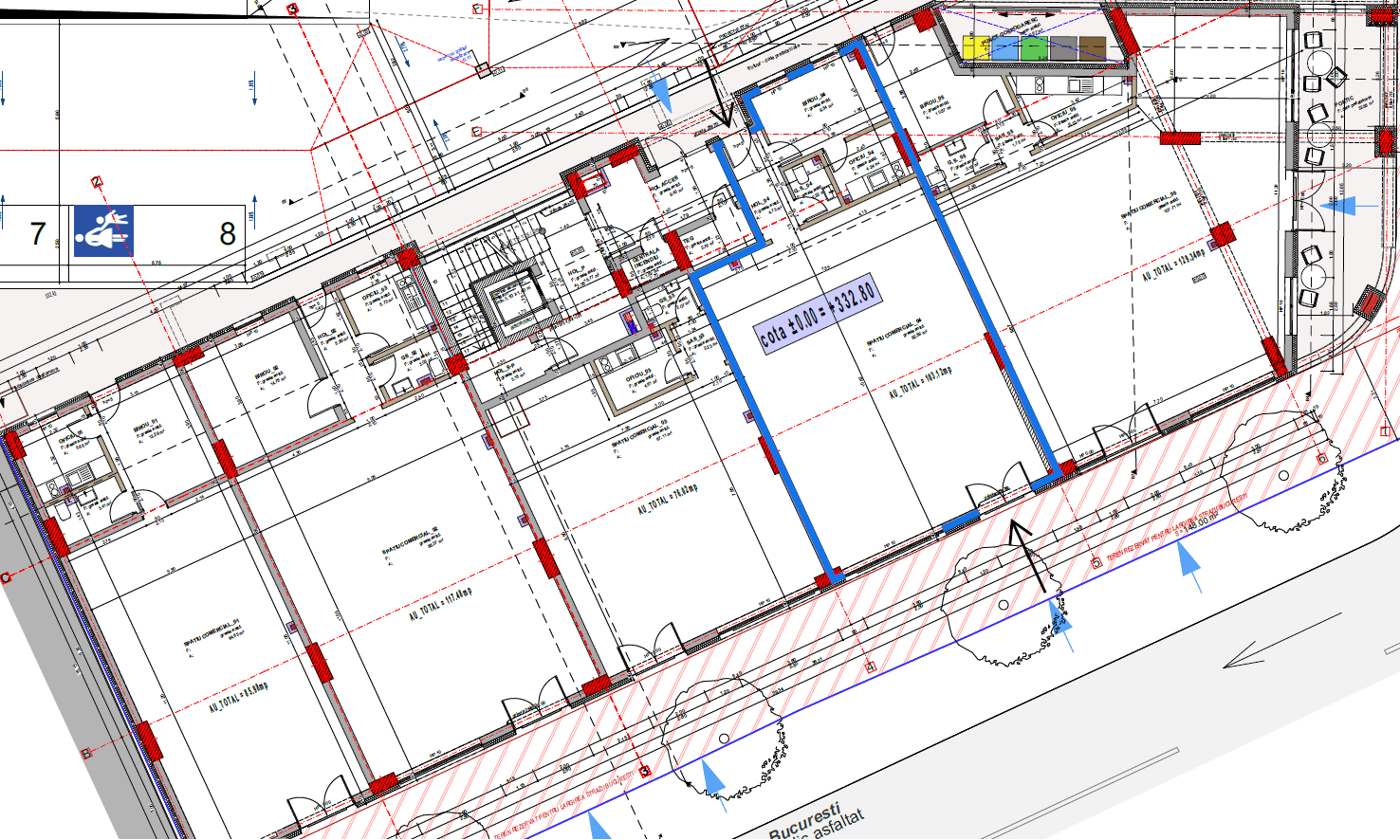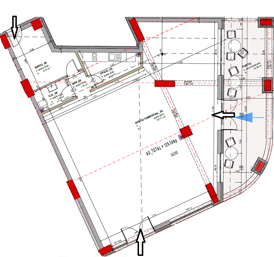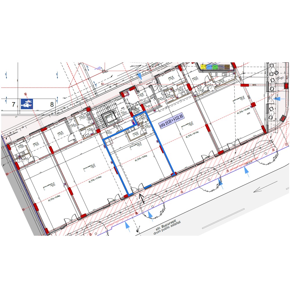 We have the largest area in this space, 129 sqm useful. Here we have three entrances, from București Street, from the side of the building and from the backyard. To the east there is a portico that can be used as a terrace. The height is 3 m, and parking will be available outside.