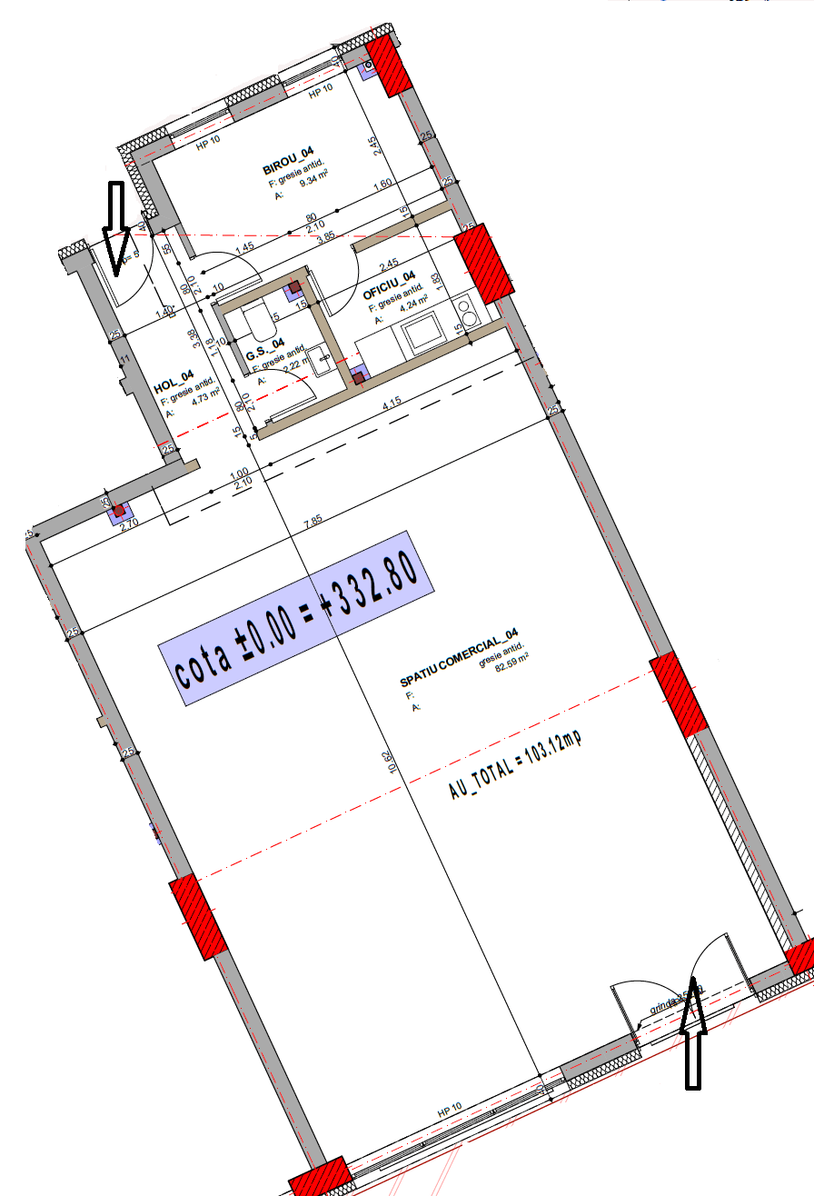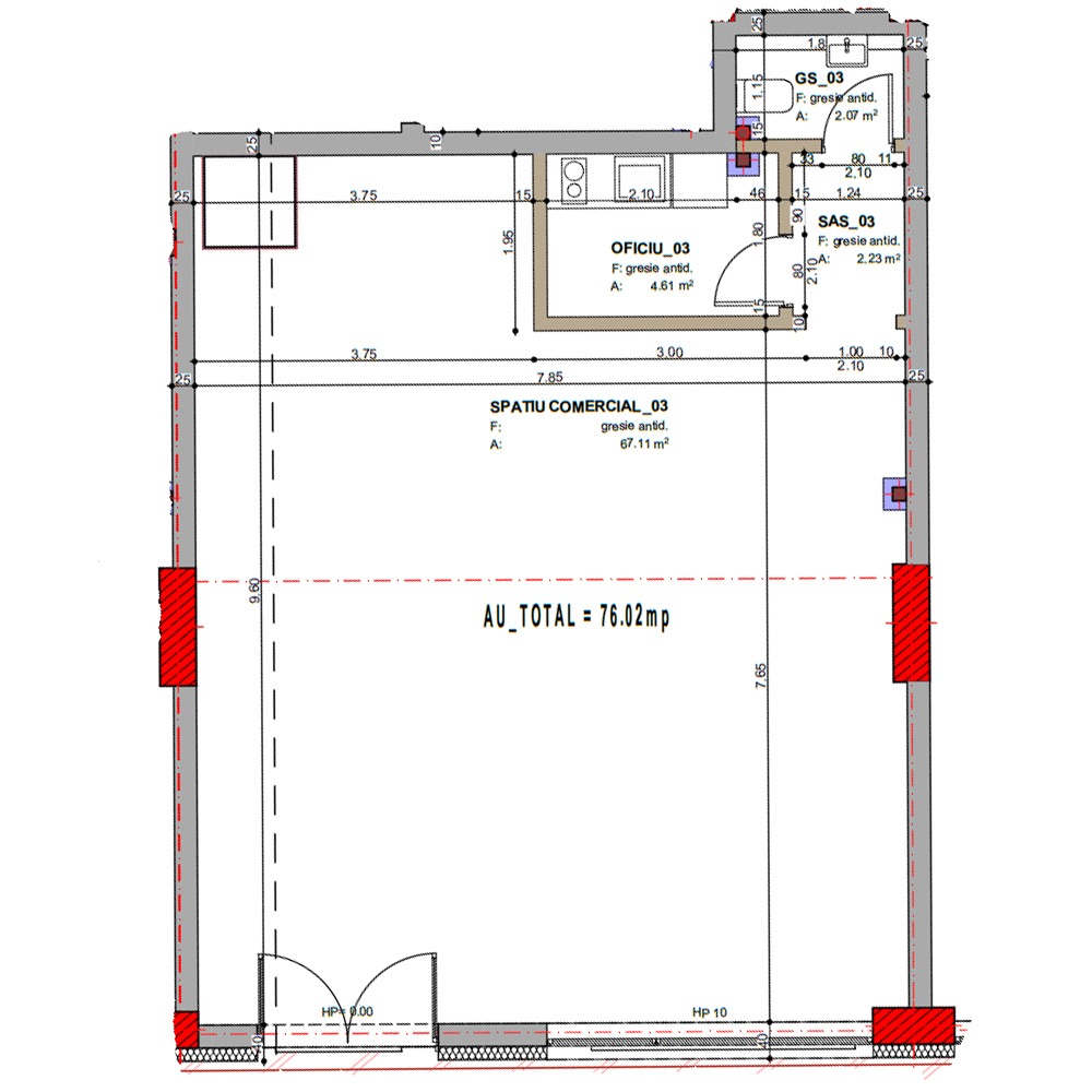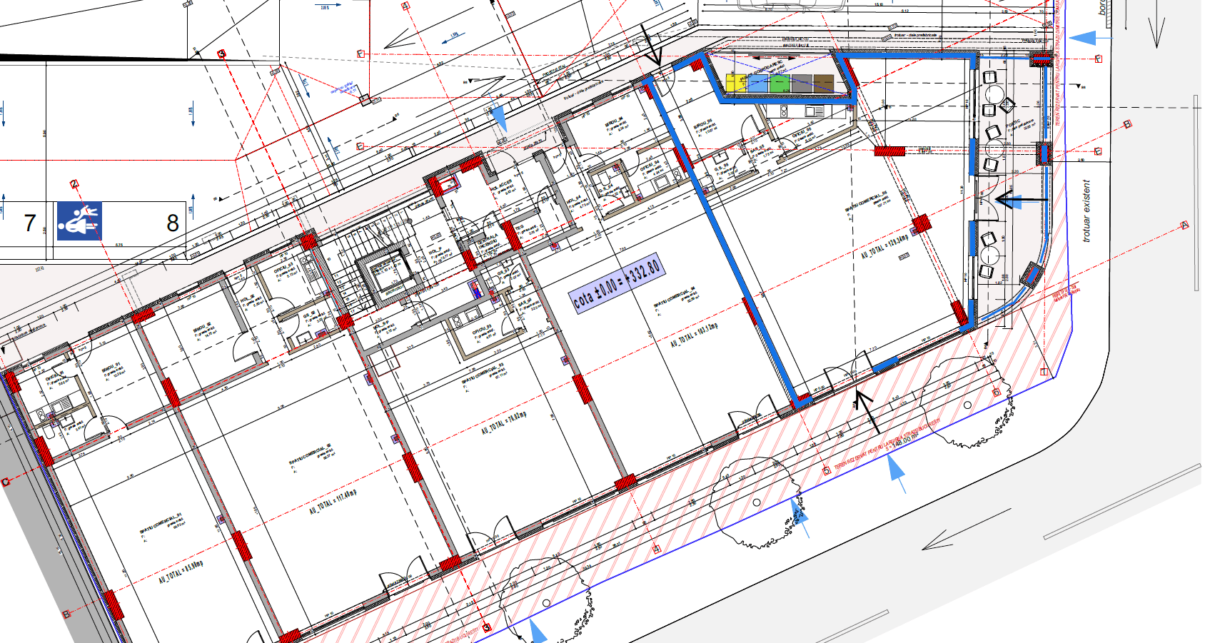 We have the largest area in this space, 129 sqm useful. Here we have three entrances, from București Street, from the side of the building and from the backyard. To the east there is a portico that can be used as a terrace. The height is 3 m, and parking will be available outside.